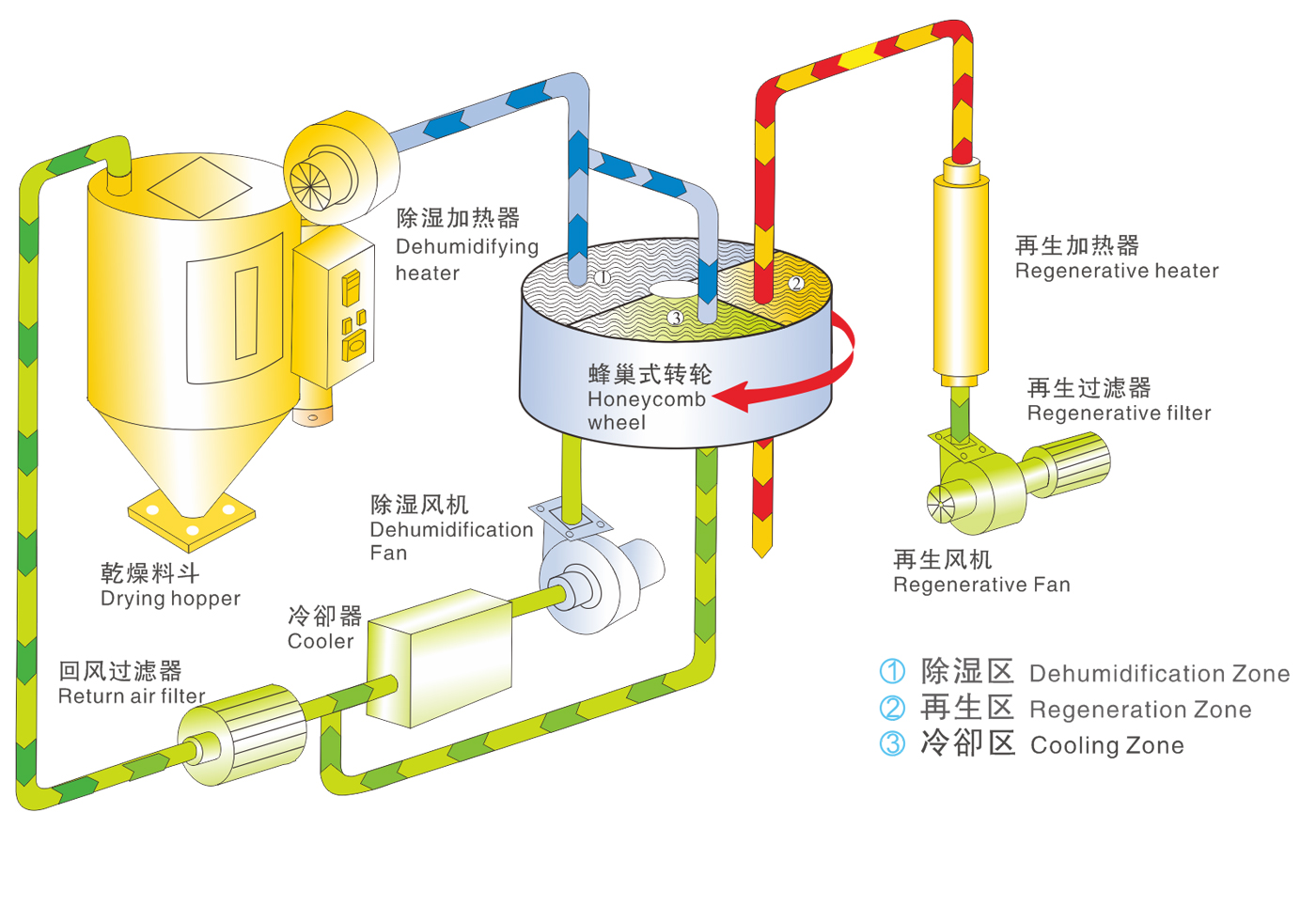 1、采用蜂巢式可清洗陶瓷转轮,长期运转仍不会产生粉屑,可保持原料的洁净度,免除污染,确保产品品质。