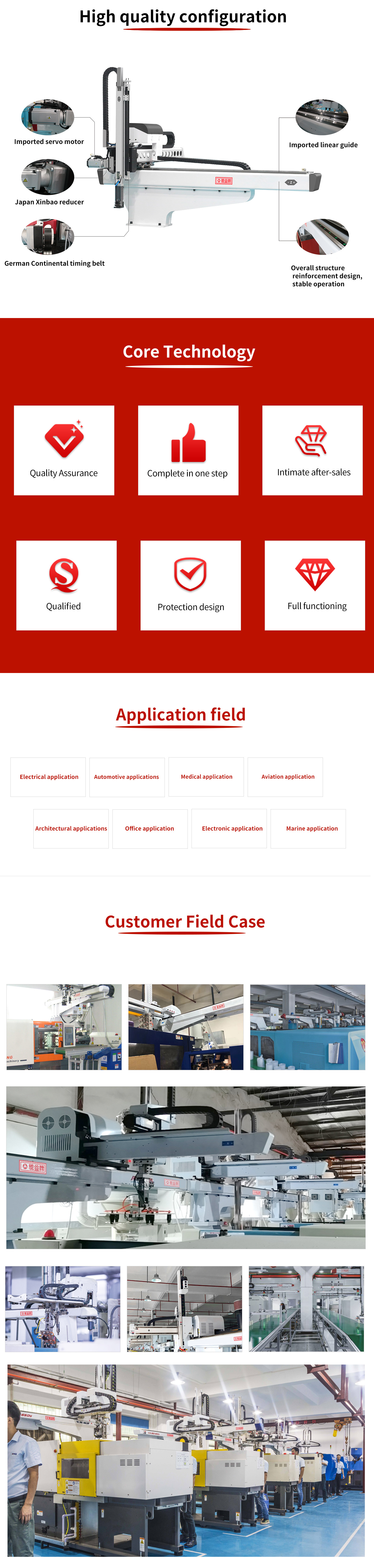 YS大型系列為升放式(牛頭式)機械手,標配為雙截開放式,三軸伺服驅動。伺服驅動優點:調試方便,運行速度快,動作平穩,使用壽命長。雙截式優點:減低機械手的整機高度,動作穩定性好,手臂上下速度快。引拔開放式;主要適用拿取長條型、面積大的塑膠產品(如汽車保險杠,地臺板等)。