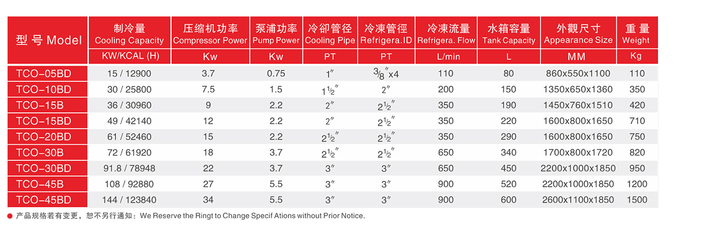 TCO-B水冷式箱型冷水机系列 水冷式采用壳管式冷凝器,导热快,散热效果佳。可提供+5~+35℃(温差不超过plusmn;1℃),超低温型冷水机温度可达-15℃以下,压缩机功率从5HP~60HP,制冷量能力可达12900~122760Kc....
