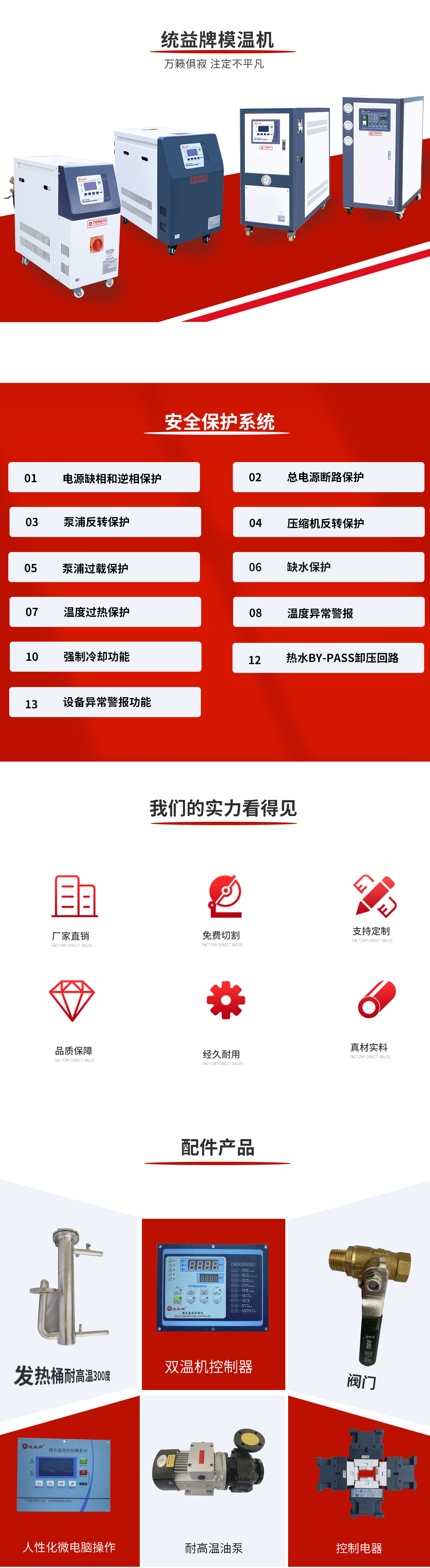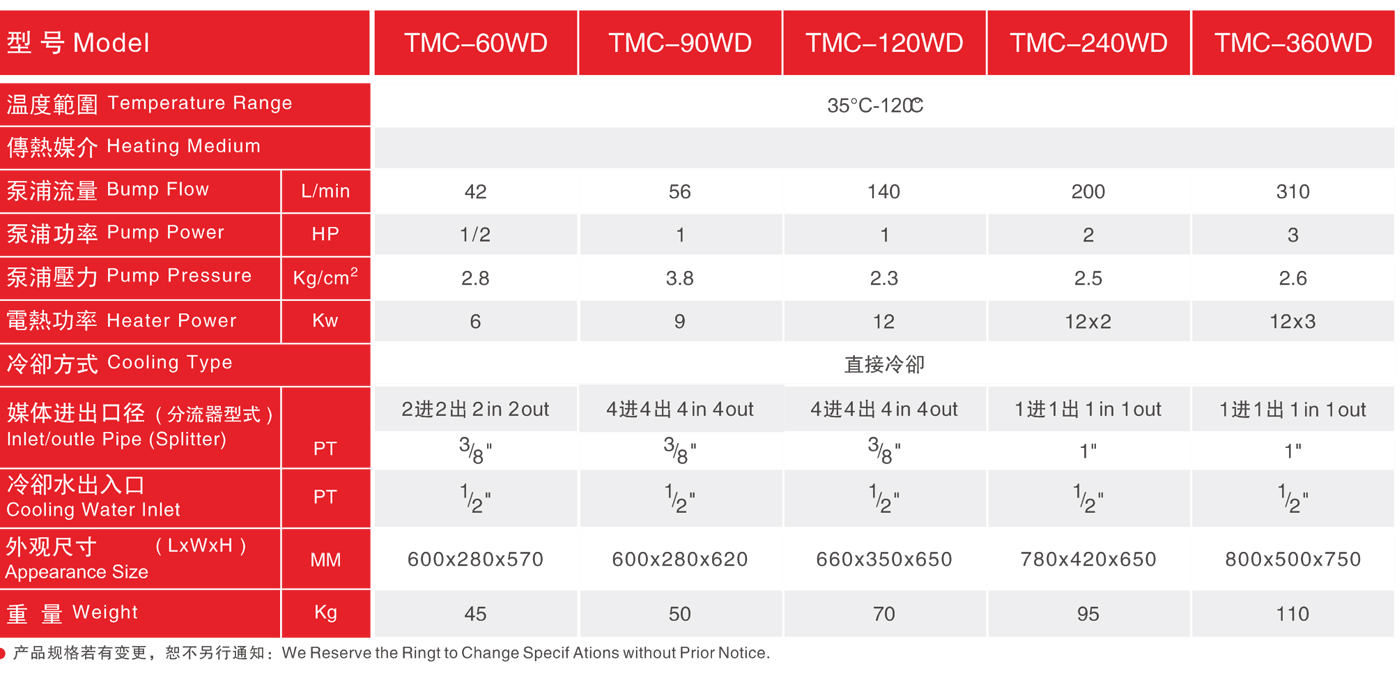 TMC水式模温系列 使用水为传热媒介,以直接冷却方式达到热交换。具有热传导效率高,污染少,水资源容易取得,使用成本低等优点。标准型温度控制达35~120℃。