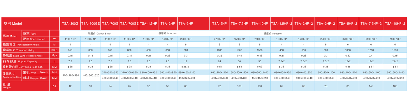TSA-300G真空吸料机 本机主要用于将流动性强的新料(主料)或次料直接快速输送到注塑机上,可掀式的真空马达上盖能保证清洗快速维护简便。